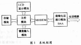 系統(tǒng)框圖見圖1。該系統(tǒng)的核心是主控模塊,主要由微處理器構(gòu)成,控制整個(gè)系統(tǒng)軟硬件的運(yùn)行。一方面處理各部分外圍電路的控制信息,另一方面完成接收和需要發(fā)送的信息的智能化處理,其功能具備可擴(kuò)展性,為以后功能進(jìn)一步加強(qiáng)保留軟件接口;存儲(chǔ)模塊包括外部RAM、EPROM存儲(chǔ)器和相應(yīng)的掉電保護(hù)電路,用于存放系統(tǒng)運(yùn)行中需要處理、交換的數(shù)據(jù),同時(shí)還用于存儲(chǔ)接收到的或需要發(fā)送的數(shù)據(jù)信息;EPROM主要用于存放系統(tǒng)軟件及存放漢字字庫;鍵盤輸入模塊用于接收來自用戶的輸入數(shù)據(jù),包括控制信息和數(shù)據(jù)信息,它是用戶對(duì)該系統(tǒng)的輸入接口;LCD模塊由LCD顯示器及相關(guān)控制電路組成,可以顯示中文、英文、數(shù)字和各類字符,它是該系統(tǒng)對(duì)用戶的輸出接口。MODEM模塊由一片嵌入式MODEM芯片及相關(guān)外圍電路組成。一方面用于調(diào)制由主控模塊送來的數(shù)據(jù),將數(shù)字信息轉(zhuǎn)化為模擬信號(hào),送入前端電話接口模塊DAA電路;另一方面將DAA電路接收的模擬信號(hào)轉(zhuǎn)化為數(shù)字信號(hào),并交給主控模塊進(jìn)一步處理。它是所有信息的進(jìn)出口,起著至關(guān)重要的作用。