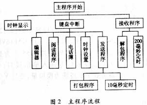 電話終端的核心是MCS-89C52微處理器。通常情況下,微處理器工作在低功耗方式,當(dāng)有鍵按下時(shí),退出低功耗模式,進(jìn)入主菜單。在主菜單中,用戶可以選擇操作。為減少冗余代碼,軟件采用匯編語言編寫,字庫固化在外部擴(kuò)展的EPROM中,內(nèi)部EPROM存放程序。圖2為主程序流程。