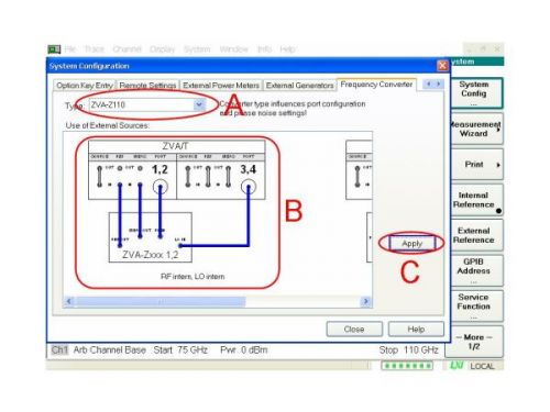 在圖2所示的A、B、C三個區(qū)域進(jìn)行如下測量配置:在A區(qū)擇變頻模塊型號,在B區(qū)選擇電纜連接方式,在C區(qū)點擊應(yīng)用按鍵并連接變頻模塊到網(wǎng)絡(luò)分析儀(見圖 3),然后將頻率軸調(diào)節(jié)成75GHz到110GHz(見圖2底部)此外,變頻模塊的所有測量參數(shù)會被自動設(shè)置(例如射頻和本振的倍頻系數(shù)、最佳功率電平、復(fù)位設(shè)置、連接類型WR10,以及定義和選擇波導(dǎo)校準(zhǔn)套件R&S ZV-WR10)