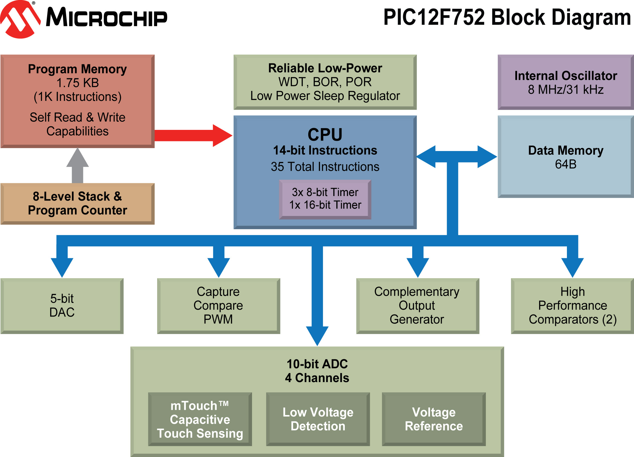 工程師們始終面臨著在降低系統(tǒng)成本同時提高系統(tǒng)性能和效率的挑戰(zhàn),特別是新近的LED照明和電池充電應(yīng)用。憑借集成的COG、高性能比較器、可直接驅(qū)動MOSFET的50 mA輸出等豐富的片上通用和專用外設(shè),PIC12F(HV)752 MCU能夠滿足這些需求。PIC12HV752 MCU是該系列中的高電壓型器件,集成了并聯(lián)穩(wěn)壓器,使器件可在2V至未指定用戶定義最大電壓下工作,其工作電流小于2 mA。這一高電壓型器件是采用高電壓電源軌的成本敏感型應(yīng)用的理想選擇。此外,4通道10位ADC可用來實現(xiàn)各種傳感器和mTouch™ 觸摸傳感應(yīng)用,包括電容式觸摸。