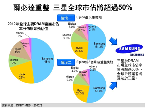 申請(qǐng)破產(chǎn)保護(hù)一舉雖為爾必達(dá)防止資金鏈立即斷裂的緩兵之計(jì),然而,無(wú)論爾必達(dá)能否重整成功,此舉將會(huì)對(duì)爾必達(dá)未來(lái)銷售與市占率造成不利影響,亦會(huì)對(duì)全球DRAM產(chǎn)業(yè)版圖造成變化。柴煥欣認(rèn)為,最顯著影響即為2012年三星于全球DRAM市場(chǎng)市占率將有可能因此超過(guò)50%,不僅會(huì)讓三星對(duì)全球DRAM市場(chǎng)價(jià)格變化影響力提升,讓其它DRAM業(yè)者面臨苦戰(zhàn)外,同時(shí)亦會(huì)讓如華碩、宏碁等系統(tǒng)業(yè)者于DRAM成本受制于三星。