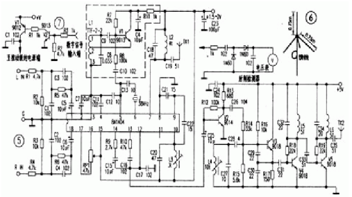 很多調(diào)頻立體聲模塊均將BAl404和外圍元件封裝在一個(gè)塑料或金屬外殼內(nèi)制成,只露出電源輸入、音頻輸入、射頻輸出引線,只要了解BAl404以后,就知道調(diào)頻立體聲模塊內(nèi)部是怎么一回事了。來自音源的立體聲音頻信號經(jīng)R1、R2、R5、C1、C3、C5(R4、R3、R6、C2、C4、C6)組成的網(wǎng)絡(luò)耦合到BAl404。經(jīng)IC內(nèi)部左(右)聲道放大,再進(jìn)行平衡調(diào)制,調(diào)制后的復(fù)合信號從IC的第14腳輸出,后與第13腳上的導(dǎo)頻信號通過B9、C15,B10、C16、C17構(gòu)成的網(wǎng)絡(luò)進(jìn)行混頻,混頻后的復(fù)合信號進(jìn)入IC的12腳,對比的⑧、⑨、⑩腳,C20--C22及髓組成的電容三點(diǎn)式振蕩器進(jìn)行調(diào)頻,IC的⑩腳上已調(diào)制的射頻信號經(jīng)內(nèi)部放大后從第⑦腳輸出,經(jīng)C18、L2選頻后送至天線TXl。要實(shí)現(xiàn)調(diào)頻立體聲,BAl404的⑤、⑥腳需外接38kHz晶體,但業(yè)余制作時(shí)的確很難購得38kHz的專用晶體,所以在無該晶體的情況下,可以參考虛線內(nèi)的電路,用分立元件制作一個(gè)38kHz振蕩器,該38kHz信號經(jīng)過R8、C10送人IC第⑤腳。制作時(shí),Ll可用收音機(jī)中頻變壓器ITF—2—1、TTF-2-2或TFF-2-9等,同時(shí)注意引腳的連接不要搞錯(cuò),③腳接地,②腳接V1的發(fā)射極,①腳為反饋和輸出腳。通過調(diào)整其磁芯可以獲得頻率較穩(wěn)定、幅度足夠高的38kHz信號。