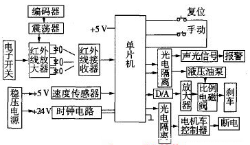 紅外線發(fā)射單元包括編碼調(diào)制器、載波振蕩器、電子開關(guān)、發(fā)射管、聚光透鏡等組成;紅外接收單元為紅外集成一體化接收頭;主控制單元由單片機、時鐘電路、復位電路、手動操作鍵盤、D/A轉(zhuǎn)換器組成;執(zhí)行單元由光電隔離器、模擬放大器組成;聲光報警單元由電機車電笛和閃光報警電路構(gòu)成;液壓制動單元由速度傳感器、液壓油泵、比例電磁閥、溢流閥、液壓油缸、剎車推桿等組成。