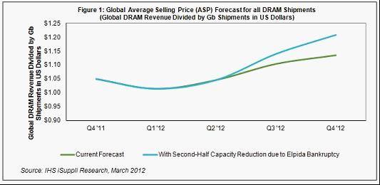 如果爾必達(dá)的產(chǎn)能減少逾25%,則到2012年底,所有DRAM出貨量的全球平均銷(xiāo)售價(jià)格(ASP)預(yù)計(jì)上升到1.21美元,比上半年末的1.05美元上漲15.5%,如圖1所示。如果不是破產(chǎn)導(dǎo)致產(chǎn)能大減,今年底價(jià)格將上升到1.13美元,只比上半年末的水平高出8.5%。