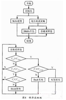 按照上述控制策略,得到如圖4的程序流程圖,其中5kHz逆變?yōu)榫鶋弘娐分械哪孀兤?,采?0%的PWM脈沖波來(lái)實(shí)現(xiàn),不需要復(fù)雜的控制算法。20kHz升壓模塊完成開(kāi)關(guān)管S1信號(hào)的產(chǎn)生。需要通過(guò)電壓采集電路,得到串聯(lián)電容的總電壓。4個(gè)判斷模塊通過(guò)判斷Vdc和Vc的電壓范圍決定對(duì)電容的充放電控制。
