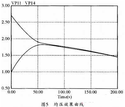 C1、C2初始電壓為2.7V,C3、C4為1V,仿真70s的時(shí)候基本均壓結(jié)束,電壓均衡到1.81V,由于電容并聯(lián)二極管的影響,電壓均衡點(diǎn)并沒(méi)有在算數(shù)平均值1.85V,并且升壓斬波器也消耗一部分能量。70s之后兩電容電壓基本保持同步變化。