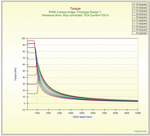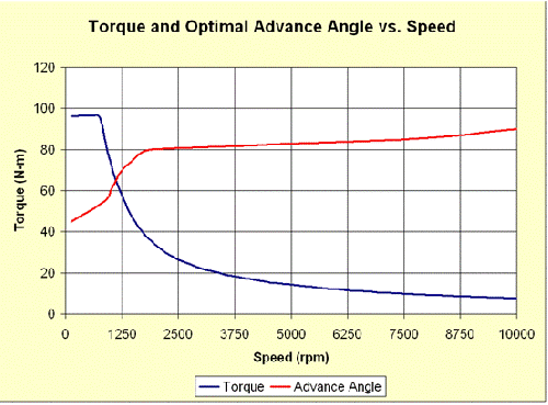 這幅圖中可以提取每個轉速下優(yōu)化超前角的峰值轉矩。當電機超過恒轉矩區(qū)域(大概875轉/分)后,弱磁的優(yōu)勢突顯出來。