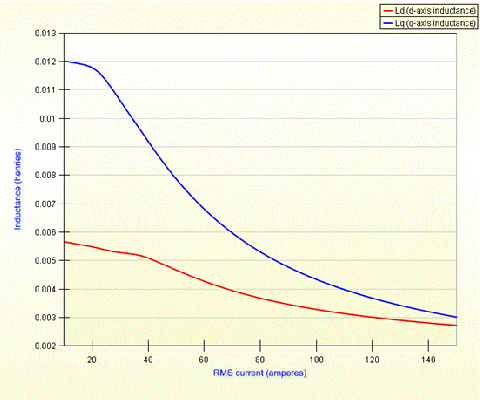 內嵌磁鋼式永磁電機的調速范圍寬是由于其具有較高的凸極比(d軸電感與q軸電感之比)。MotorSolve能準確地描述由磁路飽和引起的電感的非線性規(guī)律。上圖表明了Ld 和Lq是電流的函數。[page]