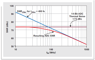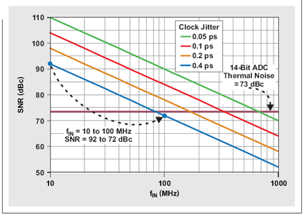 圖 5 產(chǎn)生的 ADC SNR 受熱噪聲和時鐘抖動的限制