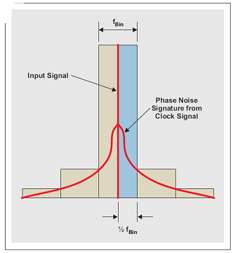 在采樣過程中,輸入信號與采樣時鐘信號混頻在一起,包括其相位噪聲。當(dāng)進行輸入信號 FFT 分析時,主 FFT 容器 (bin) 集中于輸入信號。采樣信號周圍的相位噪聲(來自時鐘或輸入信號)決定了鄰近主容器的一些容器的振幅,如圖 7 所示。因此,小于 1/2 容器尺寸的偏頻的所有相位噪聲都集中于輸入信號容器中,且未增加噪聲。因此,相位噪聲整合帶寬下限應(yīng)設(shè)定為 1/2 FFT 容器尺寸。 FFT 容器尺寸計算方法如下: