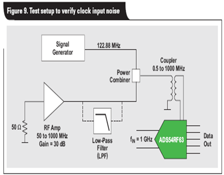 若想要驗證時鐘相位噪聲是否需要整合至?xí)r鐘輸入帶寬,則需建立另一個實驗。ADS54RF63 再次工作在 122.88 MSPS,其輸入信號為 1GHz,以確保 SNR 抖動得到控制。我們利用一個 RF 放大器,生成 50MHz 到 1GHz 的寬帶白噪聲,并將其添加至采樣時鐘,如圖 9 所示。之后,我們使用幾個不同低通濾波器 (LPF) 來限制添加至?xí)r鐘信號的噪聲量。