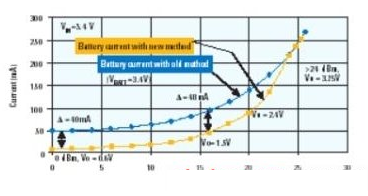 圖3:當(dāng)功率放大器使用DC-DC轉(zhuǎn)換器供電時,電池電流的節(jié)省情況