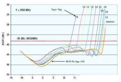 如圖3所示,為了符合鄰道功率抑制比(ACPR)的要求,DC-DC轉(zhuǎn)換器的輸出電壓必須隨著發(fā)射功率電平的變化而變化。在0d Bm到20d Bm的功率電平范圍內(nèi),電池電流可節(jié)省多達(dá)50mA。圖2表示的是功率放大器在大多數(shù)時間內(nèi),運(yùn)行在這樣的功率電平范圍內(nèi)?! ?br />