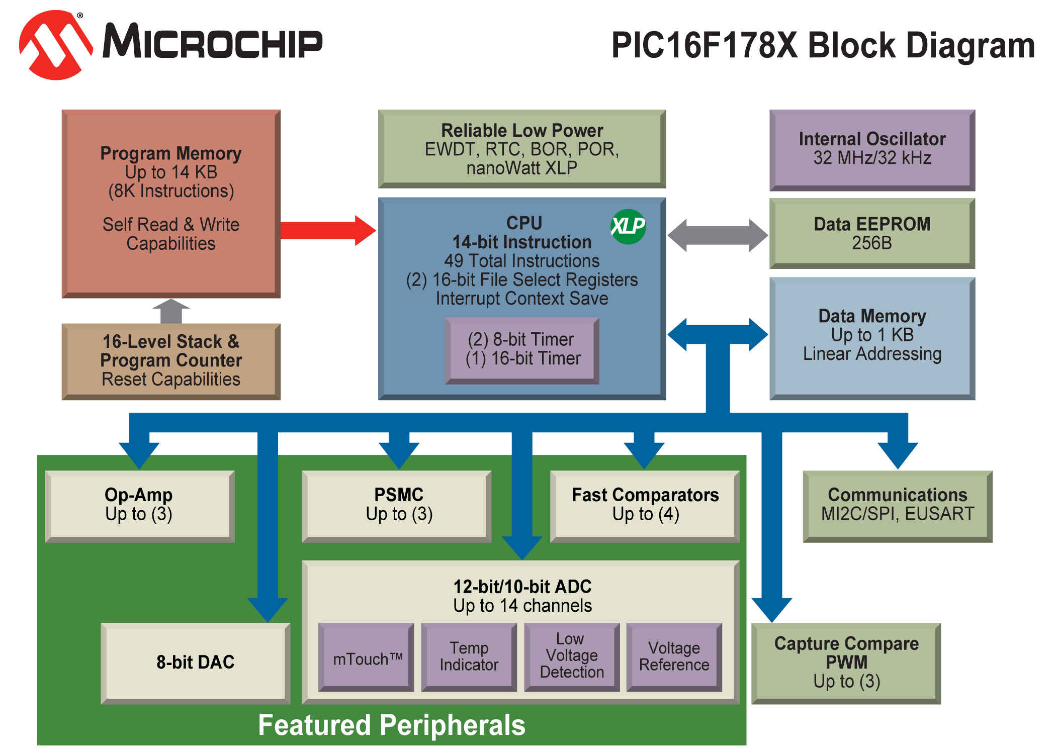 環(huán)境問(wèn)題和“綠色”倡議促使世界各地紛紛出臺(tái)新能源消費(fèi)的立法。PIC16F(LF)178X MCU使設(shè)計(jì)人員能夠創(chuàng)造出能耗更低的上佳產(chǎn)品。Microchip的增強(qiáng)型中檔8位內(nèi)核帶來(lái)了更多的性能,包括32 MHz操作、便于更快中斷處理的自動(dòng)現(xiàn)場(chǎng)保存、更高代碼密度的更高效指令集,以及更快更高的直接端口控制能力。該MCU采用28和40引腳封裝,實(shí)現(xiàn)了先進(jìn)模擬集成,包括用于測(cè)量極小電壓及實(shí)現(xiàn)mTouch™容性傳感的片上12位ADC,以及產(chǎn)生高分辨率電壓基準(zhǔn)的8位DAC。另外,片上還包括50 ns快速響應(yīng)時(shí)間的模擬比較器、捕捉比較外設(shè),以及用于通信的I2C™、SPI和EUSART接口。這些MCU還配備32 MHz內(nèi)部振蕩器、2至8K字(3.5至14 KB)閃存、128至512字節(jié)RAM,以及256字節(jié)數(shù)據(jù)EEPROM。PSMC外設(shè)是具有64 MHz操作和先進(jìn)控制能力的16位脈寬調(diào)制器(PWM)。