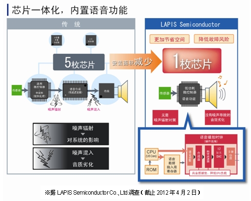 本LSI產(chǎn)品融合了憑借低功耗贏得良好銷(xiāo)售業(yè)績(jī)的LAPIS Semiconductor Co., Ltd.獨(dú)創(chuàng)的RISC方式8bitCPU“U8 Core” 和擁有30年銷(xiāo)售業(yè)績(jī)的高音質(zhì)語(yǔ)音合成與高輸出功率的功放。并且,內(nèi)置了控制IGBT的PWM電路和LCD驅(qū)動(dòng)器,僅用5V電源即可驅(qū)動(dòng)。不僅如此,由于語(yǔ)音播放功能是通過(guò)硬件實(shí)現(xiàn)的,因此無(wú)需進(jìn)行微控制器軟件處理,可輕松實(shí)現(xiàn)語(yǔ)音播放。