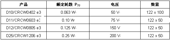 本次發(fā)布的4款設計套件采用E96系列阻值標準,范圍從10Ω到1MΩ(每檔間隔4個阻值),同時額外包含一個0Ω跳線,每款套件總共包含122種不同的阻值。電阻的容差為±1%,TCR為±100ppm/K,功率耗散為0.063W~0.25W,電阻芯電壓為50V~200V。