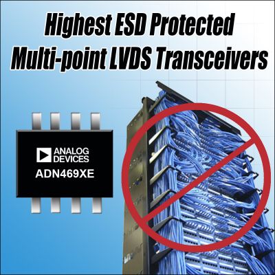 Analog Devices, Inc. (NASDAQ:ADI),全球領(lǐng)先的高性能信號(hào)處理解決方案供應(yīng)商,最近推出一系列多點(diǎn)、低電壓、差分信號(hào)(M-LVDS)收發(fā)器ADN469xE,具有所有多點(diǎn)LVDS收發(fā)器中最高的ESD(靜電放電)保護(hù)。 ADN469xE M-LVDS系列包含八款收發(fā)器,每款器件都能夠利用一條差分電纜對(duì)連接32個(gè)數(shù)據(jù)/時(shí)鐘節(jié)點(diǎn)并以100 Mbps或200 Mbps的數(shù)據(jù)速率工作。與之相比,傳統(tǒng)的LVDS通信鏈路必須使用32個(gè)單獨(dú)的點(diǎn)對(duì)點(diǎn)節(jié)點(diǎn),這會(huì)顯著增加功耗、連接器尺寸、線(xiàn)纜成本和總電路板空間。ADI公司的ADN469xE M-LVDS系列可提供8 kV IEC ESD保護(hù),是M-LVDS收發(fā)器競(jìng)爭(zhēng)產(chǎn)品的11倍。這種更高層次的保護(hù)能夠提高可插拔板和卡的可靠性,適合無(wú)線(xiàn)基站和網(wǎng)絡(luò)基礎(chǔ)設(shè)施、數(shù)據(jù)采集、自動(dòng)測(cè)試設(shè)備以及其他高速、高度網(wǎng)絡(luò)化背板和電纜應(yīng)用。