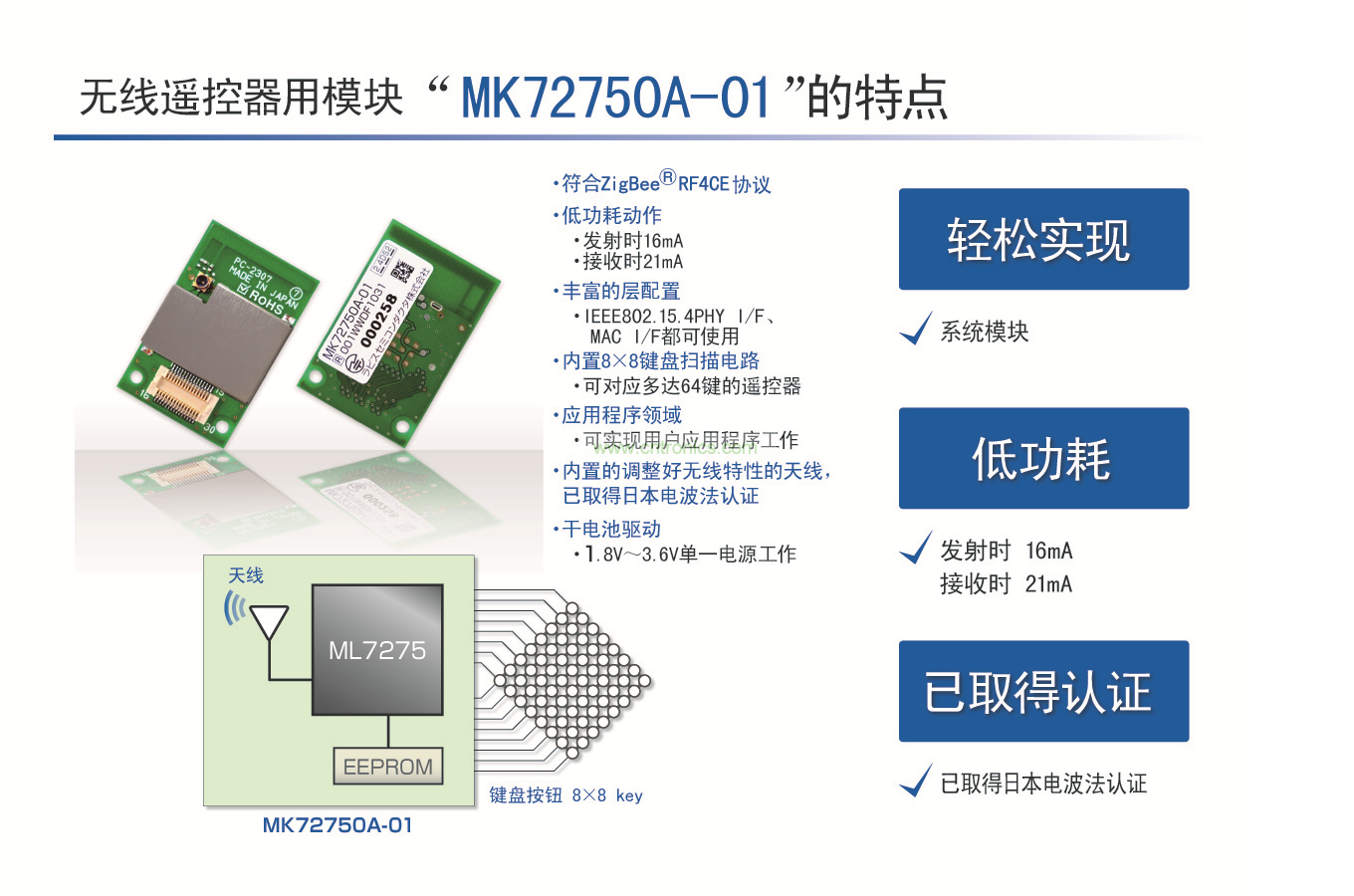 針對(duì)這種情況,LAPIS Semiconductor開(kāi)發(fā)出2.4GHz無(wú)線通信模塊“MK72750A-01”,此模塊符合“ZigBee®RF4CE”協(xié)議,并且可通過(guò)內(nèi)置的調(diào)整好無(wú)線特性的天線立即發(fā)射電波。另外,此模塊作為無(wú)線通信LSI,由于內(nèi)置了本公司生產(chǎn)的“ML7275”,因此僅此模塊可以實(shí)現(xiàn)ML7275著稱的低功耗且符合RF4CE規(guī)范的無(wú)線遙控器功能。本產(chǎn)品內(nèi)置調(diào)整好無(wú)線特性的天線,已取得日本國(guó)內(nèi)電波法認(rèn)證,所以,無(wú)線技術(shù)開(kāi)發(fā)經(jīng)驗(yàn)較少的客戶也可開(kāi)始輕松開(kāi)發(fā)。在日本國(guó)內(nèi),可以立即發(fā)射電波進(jìn)行評(píng)價(jià)、開(kāi)發(fā),因而開(kāi)發(fā)周期亦可大大縮短。另外,使用了本公司設(shè)計(jì)的無(wú)線通信LSI,LSI相關(guān)事項(xiàng)可提供迅速、精準(zhǔn)的技術(shù)支持。