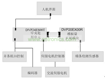 該控制系統(tǒng)的中央處理單元使用臺(tái)達(dá)DVP E系列的PLC,伺服控制系統(tǒng)使用臺(tái)達(dá)ASDA系列產(chǎn)品,人機(jī)界面使用選配DOP-B系列觸摸屏。工作時(shí),PLC通過DVP20EX00R模擬量控制模塊讀取棉條檢測傳感器的棉條厚度,對(duì)編碼器信號(hào)的處理計(jì)算出勻整1羅拉的速度,依據(jù)勻整控制關(guān)系式,就可計(jì)算出勻整2羅拉的轉(zhuǎn)速,再通過伺服控制器控制伺服電機(jī),以達(dá)到對(duì)勻整2羅拉的控制。