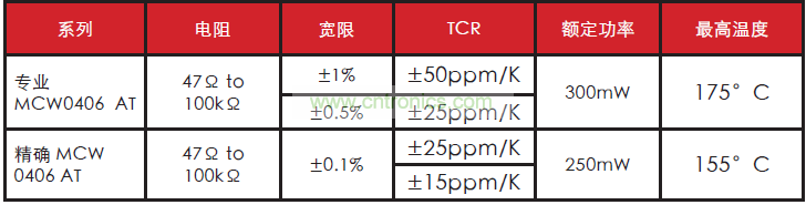 MCW 0406 AT 精密系列具有 250 mW 額定功率,電阻溫度系數(shù) (TCR) 下降到 ±15ppm/K,容差為 ±0.1%。