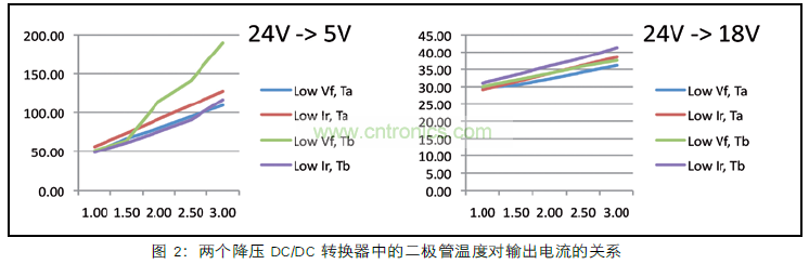 圖 2 還清楚地顯示輸入輸出電壓比。左圖顯示低占空比5 V輸出的D C / D C 轉(zhuǎn)換器。在較低的占空比時(shí),T2的時(shí)間較長(zhǎng),功耗也較高。這反過(guò)來(lái)使二極管更熱,使得Ir增加地更大,因此PT1變得更高??偟慕Y(jié)果是:在輸出電流增加時(shí),二極管的溫度會(huì)很快地升高。在電流較高時(shí),溫度實(shí)際上已經(jīng)超過(guò)了二極管規(guī)定的工作范圍。在圖 2 的右側(cè),較高的輸出電壓18V時(shí),它的占空比也比較高,這使得PT2損耗保持在可控制范圍內(nèi)。二極管上產(chǎn)生的熱量較少,使得Ir增加的幅度較小,因此,PT1會(huì)更少,并且整體溫度升高幅度較小。