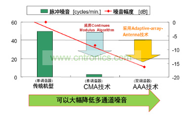 圖2將CMA及AAA技術(shù)的多通道噪聲消除性能與傳統(tǒng)技術(shù)單調(diào)諧器進(jìn)行了比較。左邊縱軸是每分鐘脈沖噪聲的發(fā)生次數(shù),右邊縱軸是噪聲強(qiáng)度,很明顯,安森美半導(dǎo)體的單調(diào)諧器技術(shù)可以大幅降低多通道噪聲,且雙調(diào)諧器AAA技術(shù)幾乎可以完全消除多通道噪聲。