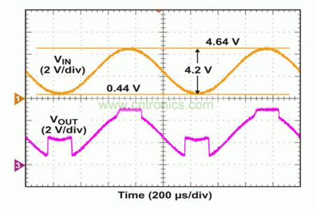 為了測試該電路,我們將VCC/2 = 5V DC偏移的300 Hz正弦波應(yīng)用于輸入端。在VOUT出現(xiàn)變化以前,一直對AC幅值進行調(diào)節(jié)。如圖4所示,當(dāng)應(yīng)用10 Vp-p輸入時,VOUT在正軌附近出現(xiàn)一個經(jīng)削波的信號,而非負軌附近。如果輸入超出VCC – 0.8V(本例中為9.2V),這種正軌附近出現(xiàn)的非理想行為是我們能夠預(yù)計到的。9.2V以下VIN電平和低至0V時,VOUT顯示出正確的波形,正如我們所預(yù)期的那樣。
