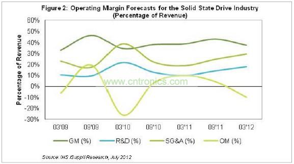 上次SSD產(chǎn)業(yè)出現(xiàn)營業(yè)利潤普遍為負的情況是在2010年上半年,與目前的情形類似。當時,幾家廠商加大銷售力度,以改善略高于35%的毛利率。這些努力取得了一些效果,2011年中期毛利率自2009年以來首次升到了40%以上。但由于產(chǎn)業(yè)競爭加劇和營業(yè)費用增加,SSD毛利率在2011年第四季度重新跌至40%以下。