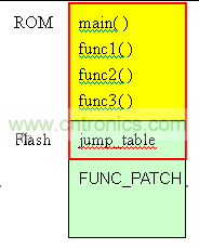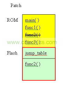 在上圖中,黃色區(qū)域是IC的ROM,這部份的程序是IC制作出來(lái)即不可以改變。綠色部份是flash。在圖中,flash分成2區(qū),一個(gè)是jump_table,存放func1~func3的地址。剩余的空間FUNC_PATCH,預(yù)留給patch使用。