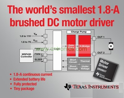 日前,德州儀器 (TI) 宣布推出業(yè)界最小型 1.8 A 有刷 DC 電機(jī)驅(qū)動器,進(jìn)一步壯大其不斷發(fā)展的低電壓 DRV8x 電機(jī)驅(qū)動器產(chǎn)品陣營。該 DRV8837 與最接近的同類競爭產(chǎn)品相比外形縮小 75%,可實(shí)現(xiàn)更小巧、更時尚、更具創(chuàng)新性的系統(tǒng)設(shè)計。此外,與現(xiàn)有器件相比,它還將 RDS(ON) 降低 50%,將睡眠電流降低 75%,從而延長電池使用壽命,提高電池供電或低電壓運(yùn)動控制應(yīng)用的散熱性能。