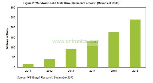 預(yù)計(jì)2013年SSD出貨量將達(dá)到9200萬個(gè),而今年和去年分別是4100萬和1700萬個(gè),如圖所示。明年過后仍將強(qiáng)勁增長,保持兩位數(shù)的速度,直到2016年,屆時(shí)預(yù)計(jì)SSD出貨量將達(dá)到2.4億個(gè)。