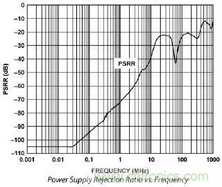 電源抑制(PSR)測量電源紋波如何與ADC輸入耦合,顯現(xiàn)在其數(shù)字輸出上。如果PSR有限,相對于輸入電平,電源線上的噪聲將僅會受到30至50 dB的抑制。