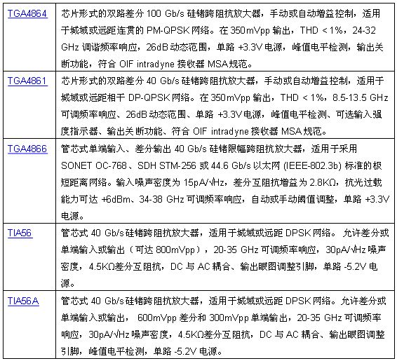 TriQuint新的跨阻抗放大器TGA4864、TGA4861、TGA4866、TIA56和TIA56A提供了許多片上 (on-chip) 的優(yōu)勢;現(xiàn)已供應樣品。