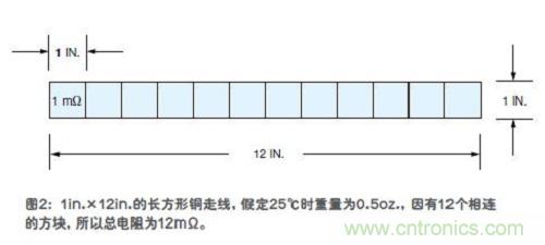 我們舉一個簡單的例子。圖2是一條長方形的銅走線,在25℃時其重量約為0.5oz.,走線寬度為1英寸,長度為12英寸。我們可以將走線分解成一系列方塊,每個方塊邊長都是1英寸。這樣,總共就有12個方塊。按照表2,每個0.5oz.重的銅箔方塊的電阻為1mΩ,現(xiàn)在共有12個方塊,因此走線的總電阻為12mΩ。