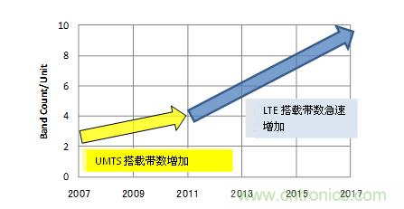 3G技術(shù)只是一種上行和下行達(dá)到數(shù)Mbps程度的速度,但是LTE卻以上行50Mbps以上,下行100Mbps以上的速度,達(dá)到了與固定通信網(wǎng)絡(luò)速度相同的目標(biāo)。GSM/UMTS對(duì)應(yīng)終端中,通常都是GSM搭載4個(gè),UMTS搭載2-4個(gè)頻帶,如果要對(duì)應(yīng)LTE的話(huà)還會(huì)再追加1-2個(gè)頻帶。圖1是移動(dòng)設(shè)備中搭載的平均頻帶數(shù)的推測(cè)圖。網(wǎng)絡(luò)上的通信量增大的同時(shí),保證了通信容量、通信頻率,LTE頻帶的搭載數(shù)量預(yù)測(cè)也將迅速增加。