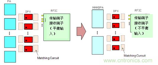 移動(dòng)終端的前端部分搭載的電子元器件隨著通信功能的混載和搭載頻帶數(shù)量的增加,正在日漸小型化。在構(gòu)成無(wú)線(xiàn)通信設(shè)備的同時(shí),RF收發(fā)器IC(RFIC;射頻集成電路)是必備的元器件。RFIC具有變化電波頻率、調(diào)節(jié)和調(diào)整信號(hào)功能。RFIC的接收端輸入端子的趨勢(shì)是由平衡輸入轉(zhuǎn)化成不平衡輸入,通過(guò)實(shí)現(xiàn)不平衡輸入的信號(hào)處理來(lái)達(dá)到削減RFIC端子數(shù)量的小型化目的。另外,PA的信號(hào)強(qiáng)度增加,采用了MMMB(多模多頻段)PA。如果只用對(duì)應(yīng)一個(gè)頻帶的PA構(gòu)成的話(huà),那只搭載頻帶數(shù)的PA就變得非常必要了,MMMBPA對(duì)應(yīng)的是多波段,一個(gè)元器件就能覆蓋多個(gè)的頻帶。如果使用這個(gè)的話(huà),可以通過(guò)減少元器件個(gè)數(shù)來(lái)實(shí)現(xiàn)縮小搭載面積的目的。電感器、電容這種匹配的元件也不例外,可以推進(jìn)從0603尺寸(0.6×0.3mm)到0402尺寸(0.4×0.2mm)的小型化。