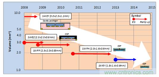 圖4所示是村田SAW雙工器產(chǎn)品尺寸的變遷。從舊的空腔3025尺寸(3.0×2.5mm),到后來(lái)通過(guò)確立樹(shù)脂封止方法將CSP型號(hào)成功產(chǎn)品化,實(shí)現(xiàn)了小型化。再后來(lái),通過(guò)改善電極設(shè)計(jì)和加工技術(shù),繼續(xù)完善對(duì)小型化的完善。于是,2013年成功地將1814尺寸 (1.8×1.4mm)的CSP型號(hào)SAW雙工器產(chǎn)品化。它比現(xiàn)在主流的2016尺寸(2.0×1.6mm)還要再減少20%的搭載面積,成為了支撐今后搭載頻帶數(shù)量增加的新技術(shù)。