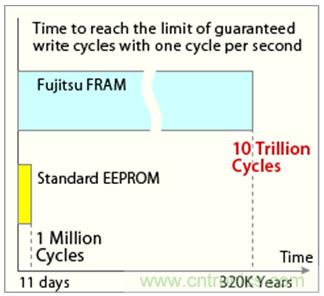 FRAM是一種兼具非揮發(fā)性與隨機存取功能的存儲器,能在沒有電源的情況下可儲存及高速寫入數(shù)據(jù)。值得注意的是,在眾多非揮發(fā)性內(nèi)存技術(shù)中,F(xiàn)RAM能保證一萬億次以上的寫入/擦除周期。富士通半導(dǎo)體自1999年開始量產(chǎn)FRAM產(chǎn)品以來,已將上述產(chǎn)品特性廣泛應(yīng)用在工廠自動化設(shè)備、測試儀器、金融終端機及醫(yī)療裝置等領(lǐng)域。