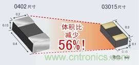 03015電阻器在量產(chǎn)的電子零部件中達(dá)到了最小型。相比以往的0402產(chǎn)品,成功地將尺寸降低了56%。