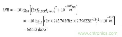 現(xiàn)在,通過計算得到了所有必須的要素,但依然缺少最后一個公式。 需要計算此抖動對AD9643的SNR產(chǎn)生的影響。 現(xiàn)在來看看這個公式是什么,然后代入已知數(shù)。已知時鐘頻率和rms抖動。 從AD9643數(shù)據(jù)手冊中可以得到140 MHz模擬輸入頻率下的SNR等于71.4 dBFS。 使用公式,可以看到結(jié)果為: