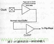 采用這種輸入電路后,由于常規(guī)I/O是三態(tài)的,因此用戶不必?fù)?dān)心時(shí)鐘進(jìn)入器件。當(dāng)然,增加一級(jí)門電路會(huì)產(chǎn)生0.6ns的較大時(shí)鐘延時(shí),幸好這在多數(shù)低功率設(shè)計(jì)中是可以接受的。注意應(yīng)將與CLKINT緩沖器相關(guān)的CLKA或CLKB引腳接地。