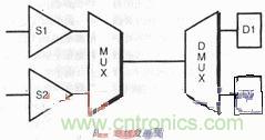 高 密度設(shè)計(jì)的布局必須留有空地并相當(dāng)?shù)卣归_,才可完成,這便導(dǎo)致連線長(zhǎng),每個(gè)線上開關(guān)多,這些因素產(chǎn)生不良的時(shí)序結(jié)果并增加了功耗。此外,塊中的邏輯趨向于 分類集結(jié)在一起,總線跨越不同塊時(shí)需走過(guò)較長(zhǎng)的距離。在一個(gè)設(shè)計(jì)中采用時(shí)分復(fù)用寬總線技術(shù),可減少總線的數(shù)量,有利于時(shí)序和功耗。再者,在DSP設(shè)計(jì)中, 數(shù)據(jù)是相關(guān)的,這表明大多數(shù)數(shù)據(jù)位并未改變狀態(tài)。攜帶相關(guān)數(shù)據(jù)的總線應(yīng)盡量復(fù)用在一起,進(jìn)一步減少M(fèi)UX、DEMUX邏輯中的開關(guān)活動(dòng)(圖5)。