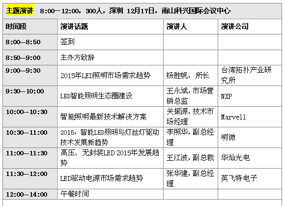 《第三屆華強(qiáng)國際LED照明前瞻技術(shù)研討會》將于2014年12月17日(周三)在廣東省深圳市科技園科興國際會議中心3樓舉行,屆時臺灣拓?fù)洚a(chǎn)業(yè)研究所所長楊勝帆、NXP市場營銷總監(jiān)王永斌、Marvell技術(shù)市場經(jīng)理關(guān)振源、明微電子副總經(jīng)理李照華、昂寶副總裁高維、昂帕董事長桑鈞晟博士、英飛特電子副總經(jīng)理張華建、華燦光電副總裁王江波、聚元微電子總經(jīng)理韓興成、綠寶石技術(shù)總監(jiān)伍松、中昊光電總經(jīng)理王孟源、華燦光電副總裁王江波、清華大學(xué)副研究員錢可元將親自前來與您共同探討2015年LED照明市場的新需求、新變化和新趨勢,精彩就在眼前,期待您也能撥冗前來共襄這一LED照明行業(yè)全明星盛會。
