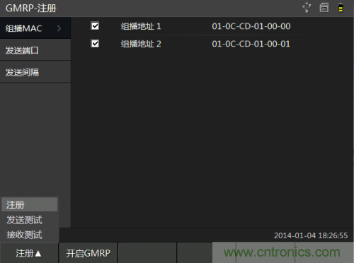 GMRP模塊在DT6000E設(shè)備總共分為注冊(cè)、發(fā)送測(cè)試和接收測(cè)試頁(yè)面。