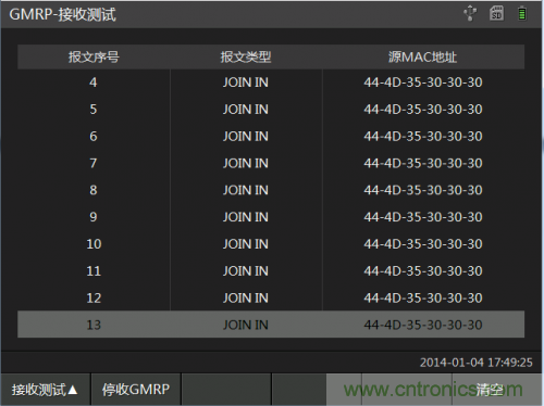 接收測(cè)試頁(yè)面用于接收來(lái)自其他設(shè)備發(fā)送的GMRP報(bào)文。界面枚舉出報(bào)文類型,以及組播地址。并且對(duì)報(bào)文內(nèi)容也可以做到解析。如圖 1-4所示: