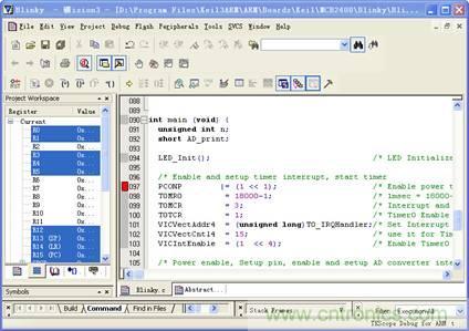 在程序窗口(包括C語言、匯編和反匯編窗口)中, 用鼠標(biāo)雙擊需要設(shè)置斷點(diǎn)的程序行,則在窗口左邊的狀態(tài)條中出現(xiàn)紅色的斷點(diǎn)標(biāo)志如圖2所示,完成設(shè)置斷點(diǎn)操作。再次用鼠標(biāo)雙擊該程序行,窗口左邊的紅色斷點(diǎn)標(biāo)志消失,則為刪除斷點(diǎn)操作。