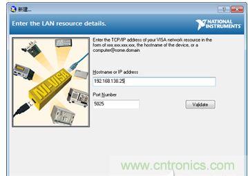 啟動Masurement & Automation Explorer軟件,選擇設(shè)備和接口,在添加網(wǎng)絡(luò)設(shè)備中,使用Manual Entry of Raw Scoket(手動輸入原始SOCKET)方式連接,ZDS2024示波器采用端口號5025來接收SCPI命令。如圖2和圖3所示。設(shè)置好后,可進行測試,確保連接成功。