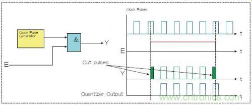 圖1:兩種選通脈沖串的方法,一種是使用選通信號E和與門(Y輸出),一種是量化器(藍色)。