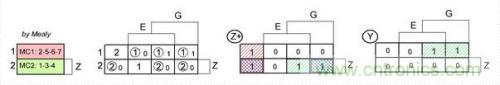 現在就很容易畫出壓縮的狀態(tài)轉換表,并為Z編碼的內存單元和輸出選通信號Y畫出卡諾-維奇圖(圖4)。