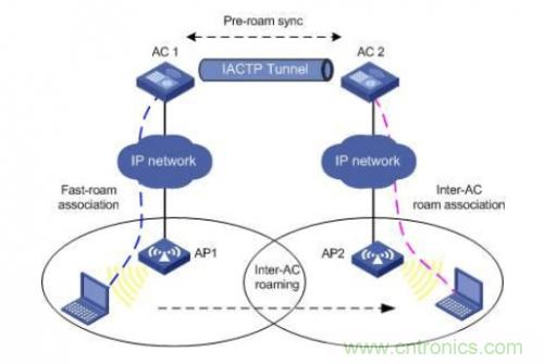 AC間漫游(Inter-AC roaming):一個(gè)無(wú)線終端從AC的AP漫游到另一個(gè)AC內(nèi)的AP中,即稱為AC間漫游。如圖2所示。